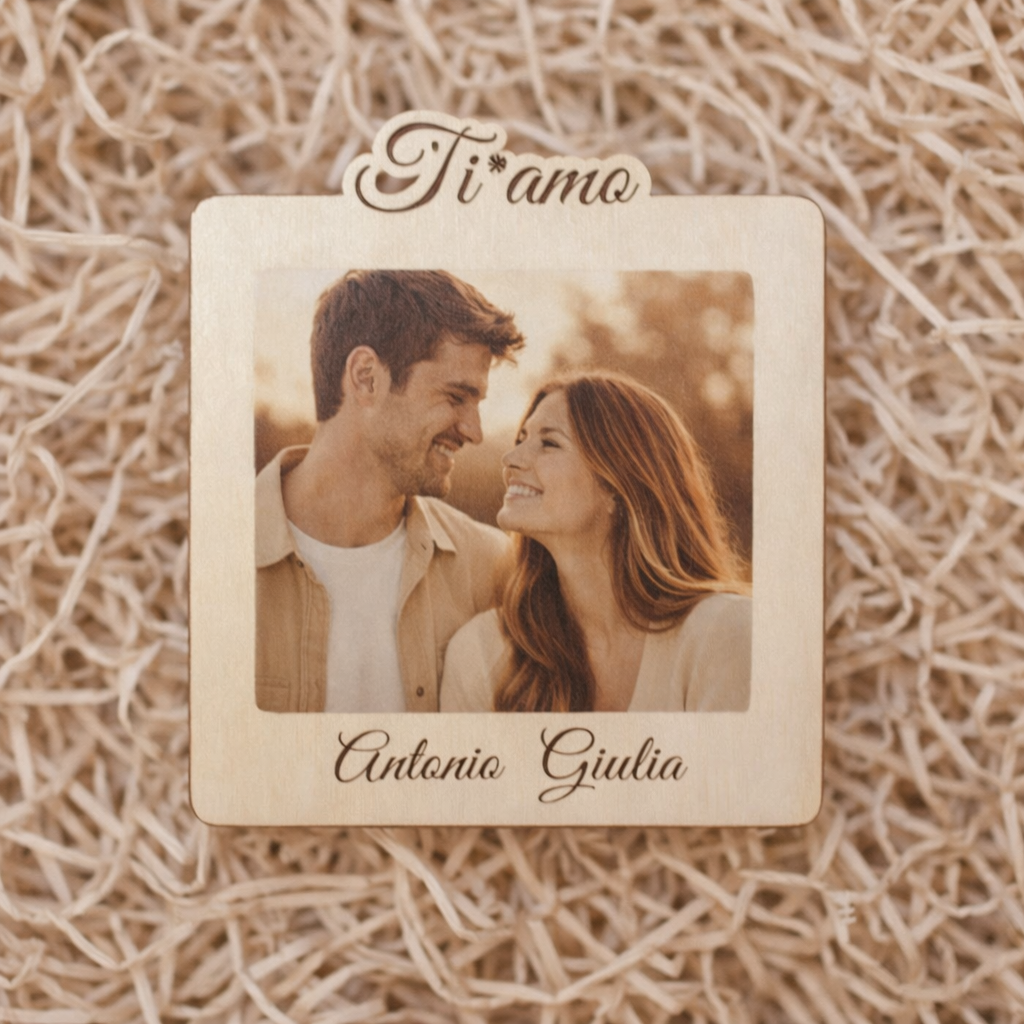 Targhetta decorativa in legno compensato personalizzata con foto, impreziosita dalla scritta “Ti amo” in rilievo e dai nomi incisi nella parte inferiore.