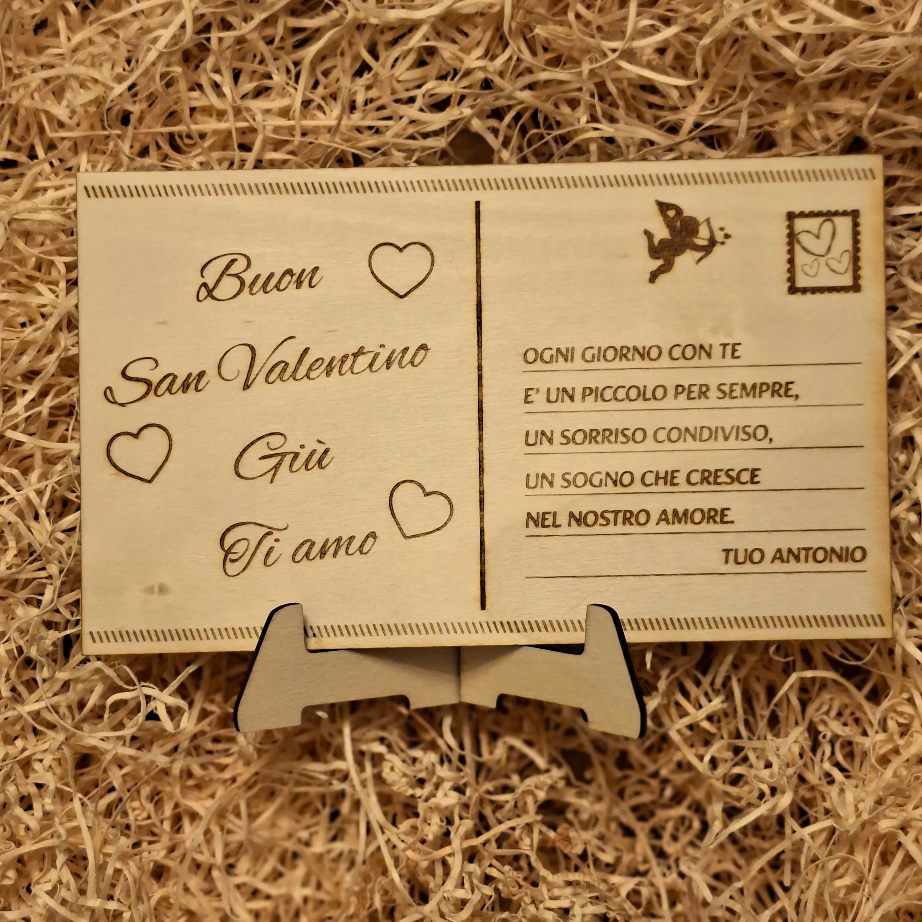 La composizione richiama una cartolina d’amore, con una dedica personalizzata su un lato e un messaggio romantico sull’altro, arricchita da piccoli dettagli grafici che rendono il design elegante e senza tempo.