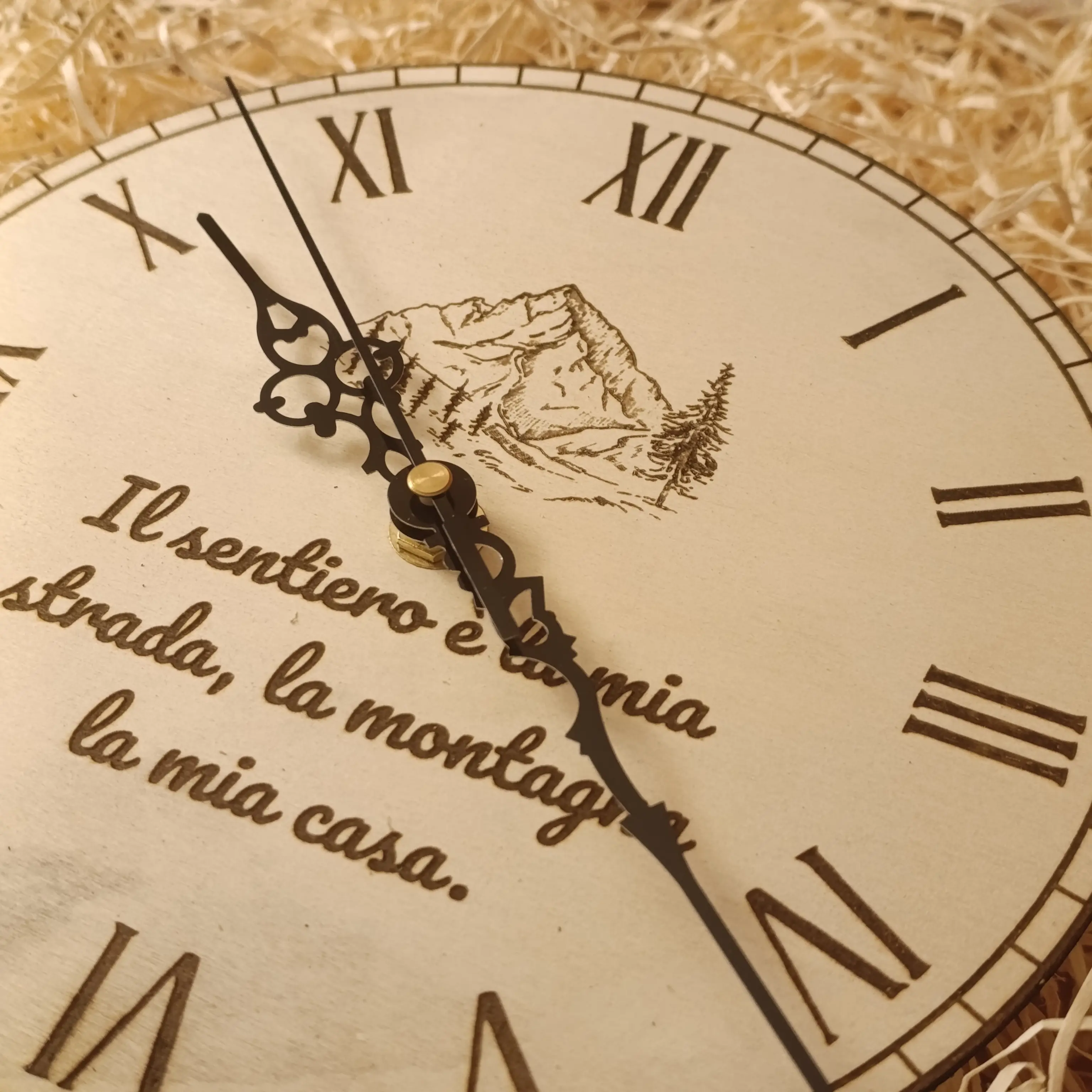 Orologio da parete in legno compensato personalizzabile con testo inciso e immagini a tema montagna, pensato per gli amanti del trekking e delle escursioni all’aria aperta.