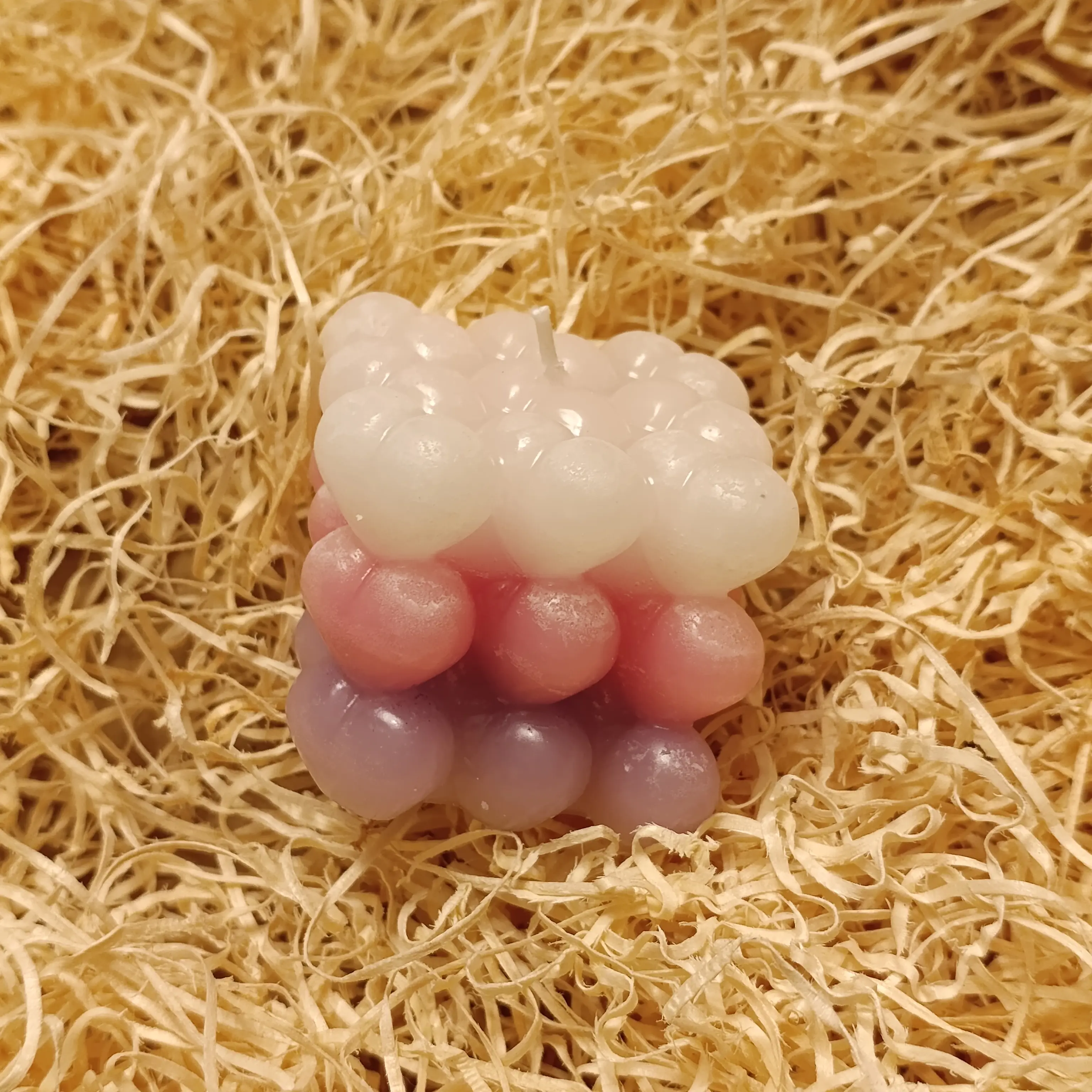Candela decorativa a forma di cubo composta da cuori multicolore in cera, ideale come idea regalo originale o elemento decorativo per casa, eventi o occasioni speciali.