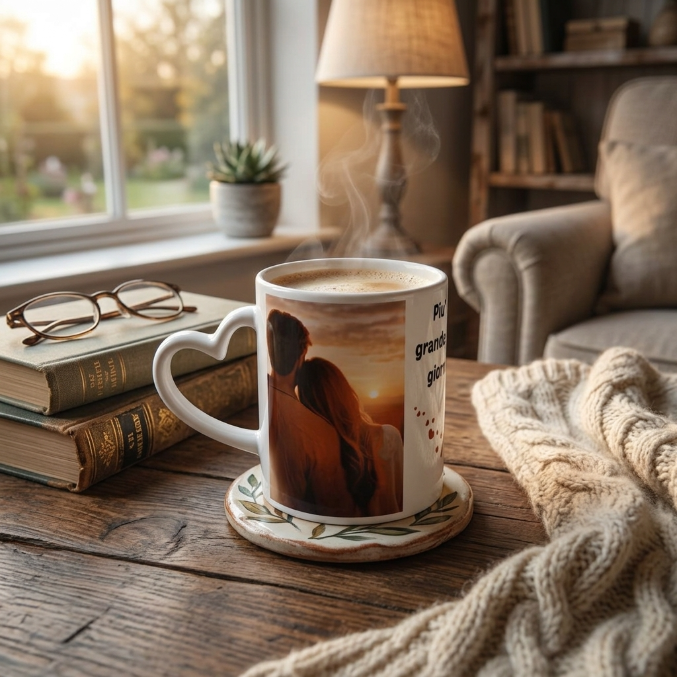 Inizia la sua giornata con un sorriso. Una tazza personalizzata con la vostra foto del cuore e una frase dedicata, per rendere speciale ogni colazione.